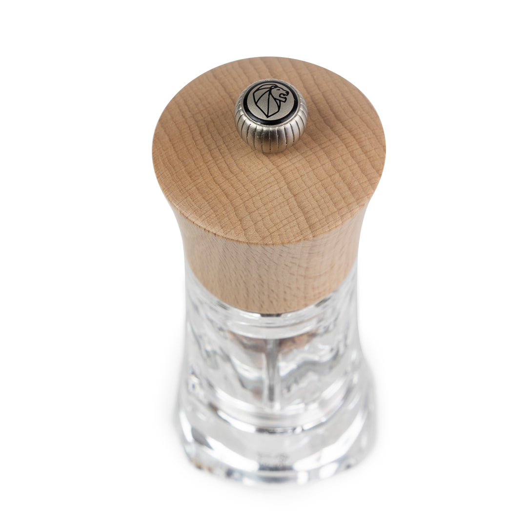 Der Körper aus hochwertigem Acryl ermöglicht jederzeit den Blick auf den Salzfüllstand, während der Kopf aus edlem Buchenholz eine warme, natürliche Haptik verleiht. Über den stufenlos einstellbaren Mahlgrad lässt sich die Körnung individuell anpassen – von fein bis grob, ganz nach Geschmack und Anwendung.